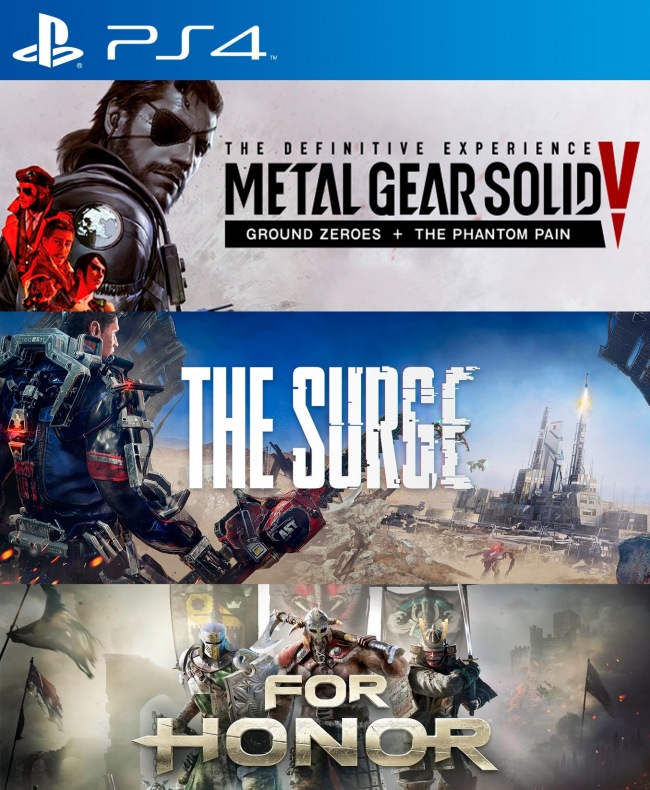 El pack incluye: - METAL GEAR SOLID V THE DEFINITIVE EXPERIENCE PS4 - The Surge Ps4 - For Honor PS4 Pesos de los juegos : 70 GB Requerido en consola : 90 GB Instalación : 1 consola